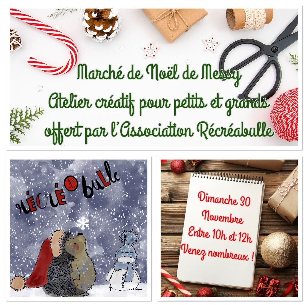 Venez célébrer la magie de Noël au Marché de Noël de Messy ! Au programme : ambiance festive, décorations, gourmandises… et surtout la délicieuse tartiflette maison préparée par l’association “Ici c’est Messy" En collaboration avec l'association "Les bienvenus", L’Association Récréabulle proposera un atelier créatif gratuit pour les petits comme pour les grands dimanche 30 novembre de 10h à 12h.