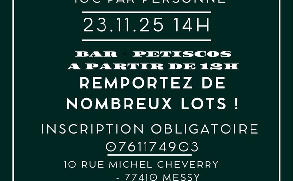 L'association Amizades do Alto Minho de Messy vous propose un week-end jeux les 22 et 23 novembre. Samedi 22 novembre : Loto à compter de 19h00 à la salle des Fêtes Dimanche 23 novembre : Tournoi...
