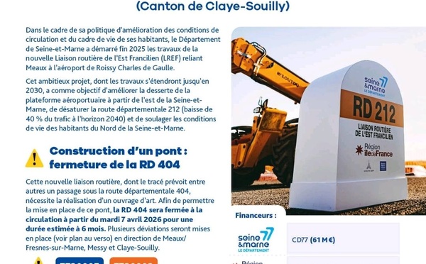 À partir du 7 avril 2026, la RD 404 sera fermée à la circulation pendant 6 mois dans le cadre du projet de liaison routière de l’Est Francilien. Des déviations seront mises en place, notamment en...